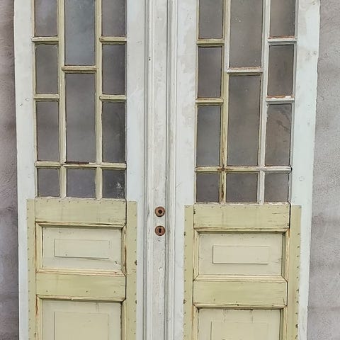Vi byter ut denna fina pardörr som vi monterade helt ny hösten 2018. Den kommer från Nordan (kanske hette Tanumsfönster då?) och har alltså karmmått 180 cm bredd och 210 cm hög.