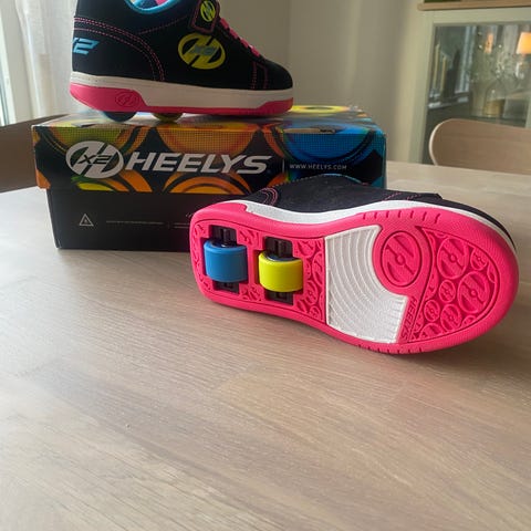 Heelys rullskor för barn i storlek 31. Skorna har inbyggda hjul i sulan som gör att de kan användas både för att gå och rulla.