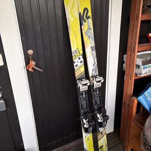 Twintip K2 Juvy skidor i orange färg med monterade bindningar. Skidorna har tvärgående spann och är anpassade för alpinskidåkning. Undersidan är svart med K2-logga och ovansidan har grafiska tryck. Passar för pist- och allmountainåkning beroende på åkarens nivå och inställning av bindningarna.