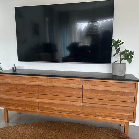 Teak sideboard med lådor. Lådorna glider lätt men måste dras ut och in korrekt annars kan de hamna lite fel. Fanér har lossnat på en list på insidan av en låda, syns bara när man drar ut den. Övrigt i fint allmänt skick för sin ålder. Perfekt förvaring & så fin design. Hämtas i Västertorp eller levereras för 500 kr.