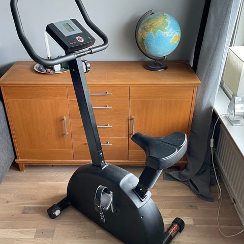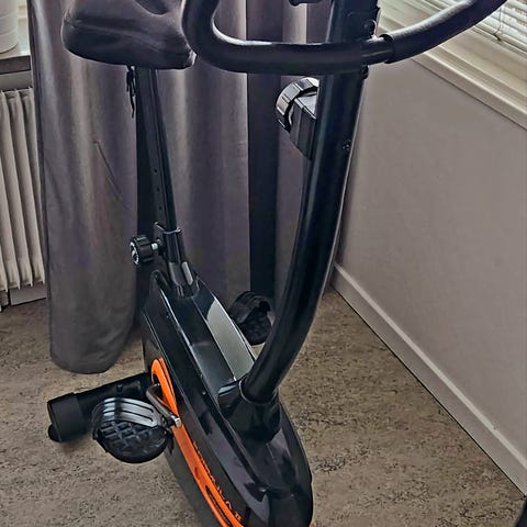 FitNord Recumbent Cyclo 200R motionscykel i svart utförande. Modellen är en liggande motionscykel med ryggstöd och justerbart säte för bekväm träningsposition. Pedalerna är placerade framför användaren, vilket ger stöd för rygg och höfter vid träning. Konstruktionen har stabil ram och fotstöd fram och bak för stadigt grepp mot golvet. Passar för hemmaträning och konditionsträning i sittande position.