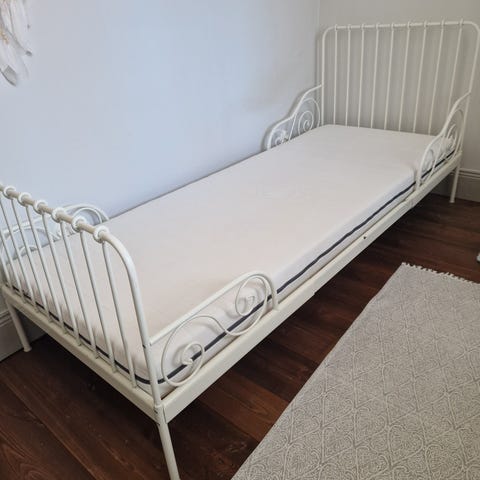 Juniorsäng, växasäng som går att förlänga. Svart stål. Ram och madrass.