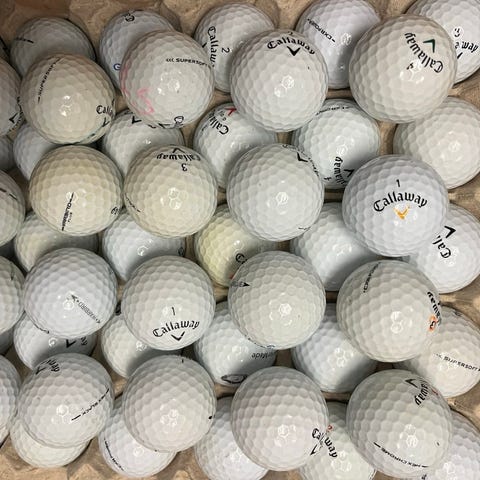 Blandade golfbollar i olika modeller och märken. Färgerna är främst vita med inslag av gula, orangea och några rosa bollar. Passar för träning eller spel där exakt modell inte är avgörande. Antalet bollar och exakta fabrikat kan variera i lådan.