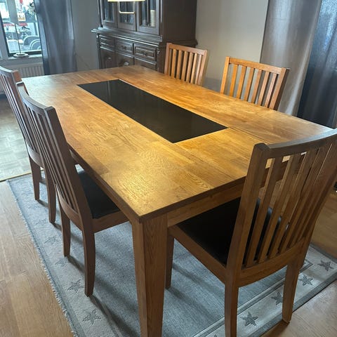 Egentillverkat matbord + fyra stolar i metall