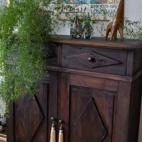 Vacker och praktisk indisk skänk, tre lådor samt tre skåp med ett hyllplan i varje. Skåpen är ”låsbara” uppe och nere.