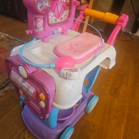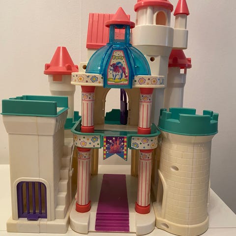 Dockhus i plast i blått och rosa med flera våningar och öppningsbara dörrar. Huset har flera rum inuti, inredningsdetaljer och en liten figurer. På sidan finns en spiralformad rutschkana eller rör som går mellan våningarna. Passar för barn som vill leka med figurer och skapa egna berättelser i ett flerplanshus.