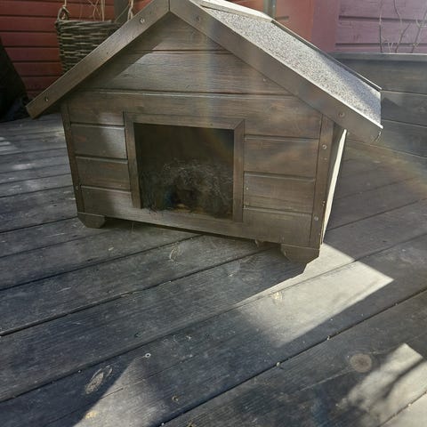 Material: Trähus med nätad utegård i metall.