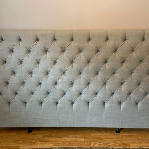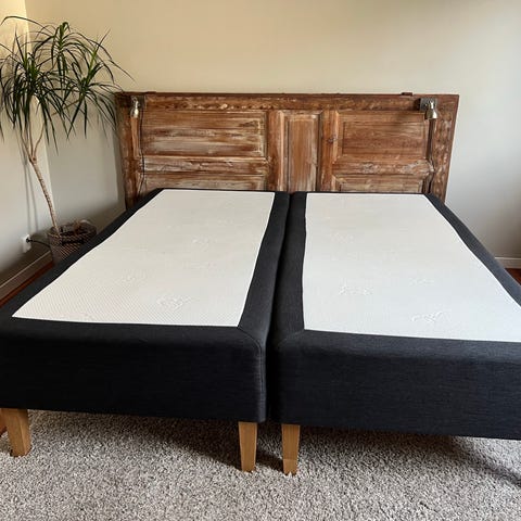 Sänggavel i mörkt trä samt 2 st sänglampor