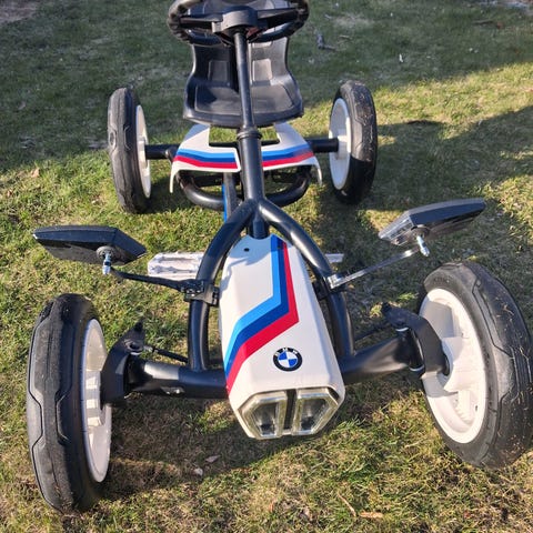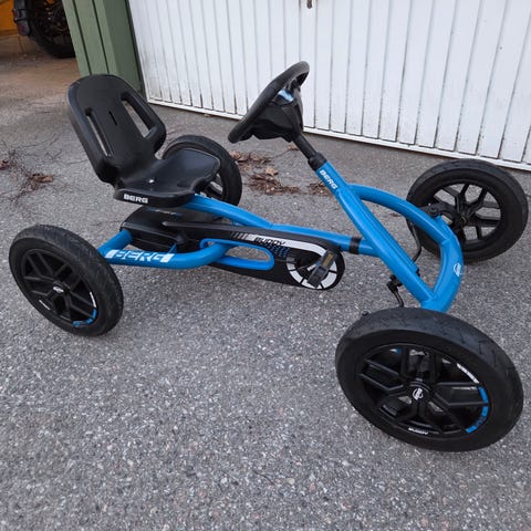 Berg trampbil i svart färg. Fyrhjulig konstruktion med plastskal, sportstol och ratt med instrumentpaneldekor. Utrustad med trampor fram, kedjedrift och breda hjul för stabilitet.