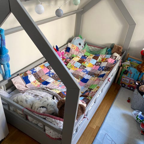 Jollyroom juniorsäng i grå färg. Sängen är anpassad för barn som växt ur spjälsäng men ännu inte är redo för fullstor säng. Den har sarger runt sidorna som kan ge viss skyddskant. Passar för standardmadrass i juniorstorlek. Lämplig som första större säng i barnrum.