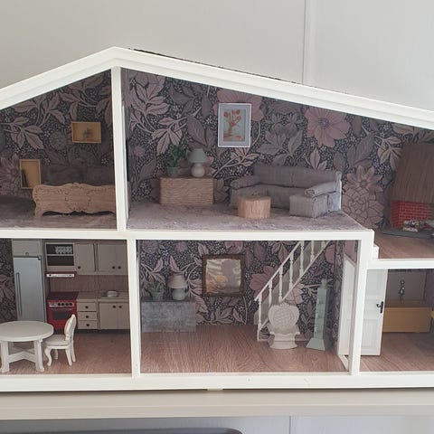 Dockskåp i trä med flera våningar och öppningsbar framsida. Utsidan är målad i blått, rött och vitt med fönster och dörrar, insidan har flera rum inredda i rosa och andra färger. Dockskåpet har trappor mellan våningarna samt möblerade rum med bland annat säng, bord, stolar och andra små inredningsdetaljer. Passar för lek med mindre dockor och figurer i hemmiljö.