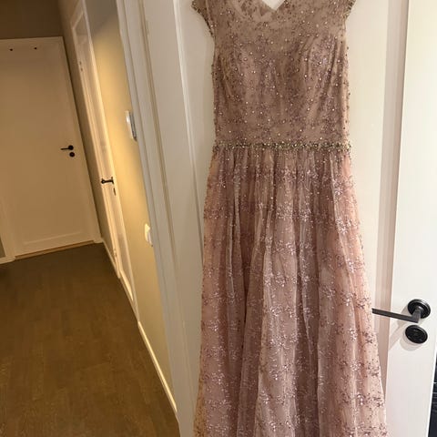 Zara sommarklänning i polyester, one size. Klänningen har lång kjol och långa ärmar. Överdelen på den ena sidan har paljettliknande detaljer och markerad midja med knytskärp, medan den andra sidan är mer enkel med rynkdetaljer framtill. Färgskalan är flerfärgad i olika nyanser. Passar som sommarklänning eller vid enklare festliga tillfällen.