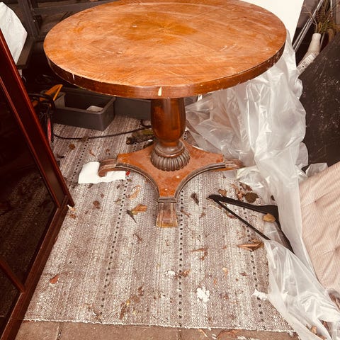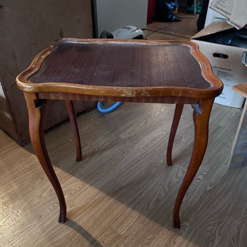 Runt sidobord i mörkt trä. Bordsskiva med markerad mittdel och synlig träådring. Fyrkantigt underrede med svarvade ben. Passar som avlastningsbord i vardagsrum, hall eller sovrum.