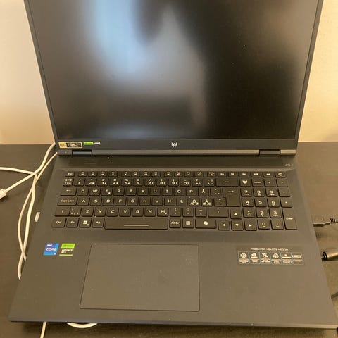 Acer Predator bärbar gaming dator i svart utförande med cirka 17-tums skärm. Datorn har fullstort tangentbord med numerisk del och markerade WASD-tangenter. Modellen är utformad för krävande användning som spel, multimedia och annan grafikintensiv användning. Passar som stationär ersättare eller för den som behöver en större skärm i bärbart format.