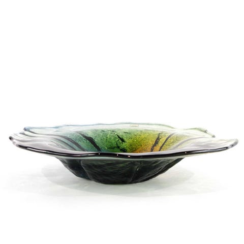 Designen är i kvadratisk form med vågiga kanter, glasyr i jade-grönt som övergår i en mörkbrun/svart kant med gula detaljer.