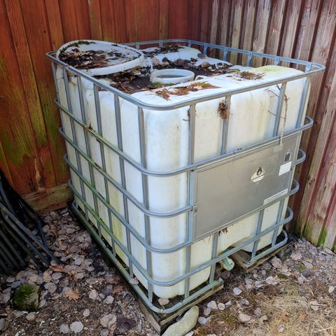 Vit cylindrisk plasttank med liggande utförande. Tanken har förstärkande ringar runt om och anslutningar upptill och i ena gaveln. Exakta mått är diameter1200 mm längd 3200mm.