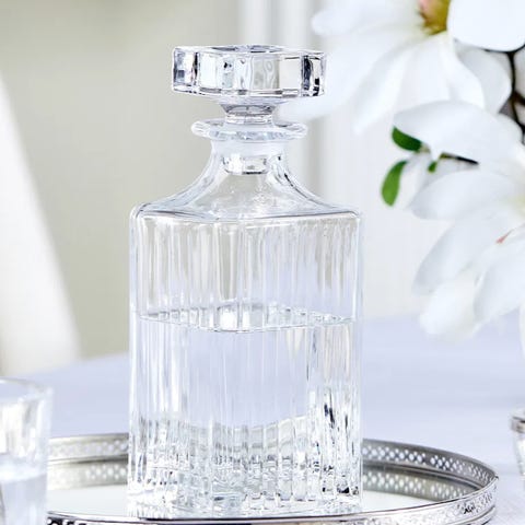 Säljer en stilren karaff i glas med dekorativ slipning och matchande glaspropp. Perfekt för whisky, rom, konjak eller som snygg inredningsdetalj i vitrinskåp eller barhörna.