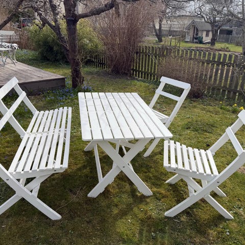 Trädgårdsgrupp med bord och stolar i vitmålat trä. Gruppen består av ett avlångt bord med ribbad skiva, två karmstolar samt en bänk med ryggstöd i samma ribbade utförande. Möbelgruppen är avsedd för utomhusbruk på altan, uteplats eller trädgård. Färgen är vit med synligt slitage som ger ett väderpåverkat utseende. Bord och sittmöbler är hopfällbara eller delvis hopfällbara för enklare förvaring beroende på montering.