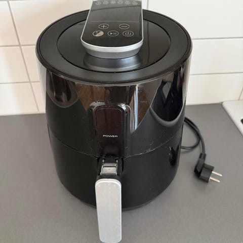 Biltema airfryer i svart utförande. Modellen har utdragbar korg framtill för tillagning av mat med varmluft. Elsladd med jordad kontakt på baksidan. Passar för tillagning och uppvärmning av olika typer av livsmedel i hushållskök. Exakta mått, volym och effekt är inte angivna.