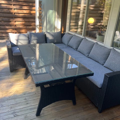 Skall flytta till mindre lägenhet där detta set blir för stort. Det är i fint skick, alla dynor och kuddar ligger på vinterförvaring i källarförrådet och även dom är i gott skick. Måtten på soffan är 230 cm x 180 cm och måtten på bordet är 144 cm x 74 cm.