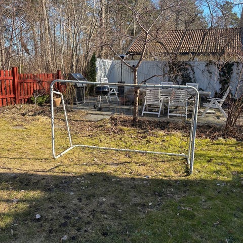 Fotbollsmål för utomhusbruk i trä med fastmonterat nät. 5 manna mål. Konstruktionen består av träram med stödben på sidorna och baksidan. Kanon för spel och träning i trädgården.