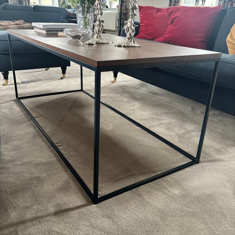 Ramen är i stål, virket är betsat med Herdins lackbets mörk ek samt lackat två varv. Finns i Luleå Lövskatan för avhämtning.