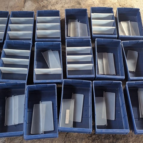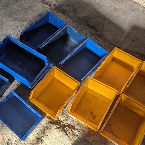 Stapelbara plastlådor i blå färg. Lådorna är öppna upptill och har perforerad botten optimalt för ventilation eller avrinning. De lämpar sig för förvaring och transport av olika typer av föremål i hem, garage, förråd, verkstad eller båt. Lådorna kan staplas på varandra för att spara utrymme när de inte används eller vid förvaring.