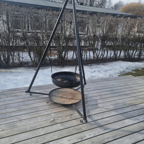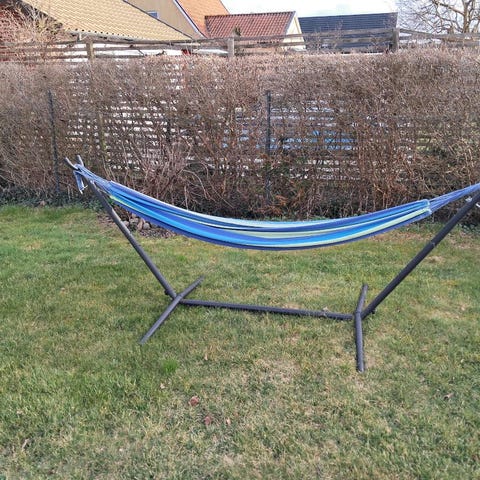 Svart ställning i trä med hängmatta. Tung och tredelad . Hängmattan är upphängd med rep och kedjor i metall, fästa i öglor på ställningen. Hängmattan är från början svart men är nu blekt på ovansidan. Ett av repen har gått av, se foto. Passar för utomhusbruk i trädgård eller på tomt där det finns plant underlag. Är köpt på Tingstad möbler i Norrköping, kan vara märket Brafab. Minns inte riktigt.