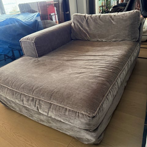 Fåtölj i grön manchesterliknande tyg med djuphäftad sits och rygg. Modellen är låg och djup med lös ryggkudde som kan justeras och spännas fast med rem. Fåtöljen kan vikas ihop och användas som bäddfåtölj eller loungemöbel. Passar i vardagsrum, gästrum eller tonårsrum som extra sitt- och liggyta.