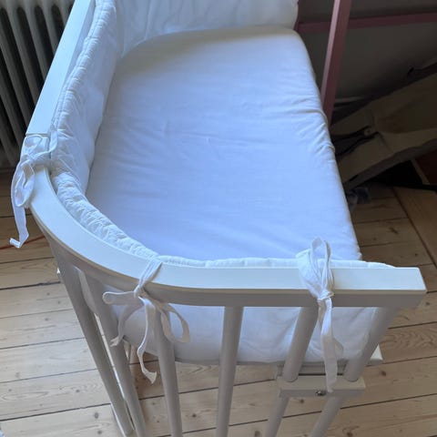 Bedside crib i vitlackat trä (nypris från 1600kr). Spjälsäng som fästs intill föräldrasängen för nära sovplats till barnet. Kan justeras i höjd för att anpassas till sängens nivå. Öppen långsida mot föräldrasängen och ribbad botten för ventilation. Finns även tillhörande kantskydd (ej på bild) som gör att det blir en fristående spjälsäng.