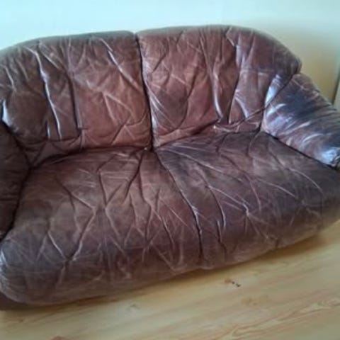 Som bilderna visar är det en skinnsoffa för två till tre personer i mörkt buffelskinn och plymåer i ljust tyg.