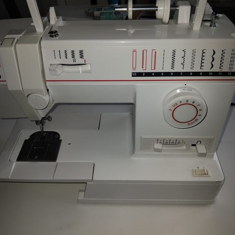 Husqvarna symaskin i elektriskt utförande. Maskinen har flera sömmar och inställningar som väljs via reglage på framsidan. På bilderna syns medföljande tillbehör i en separat låda, bland annat flera pressarfötter, spolar och nålar. En skadad transportväska ingår också. Symaskinen är lämplig för olika typer av sömnadsarbeten i hemmet, såsom lagning, uppläggning och enklare sömnadsprojekt.