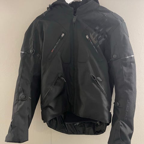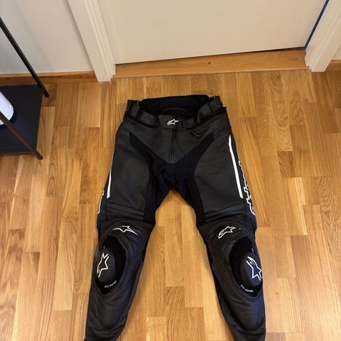 Motorcykelutrustning set jacka byxa hjälm stövlar skydd svart