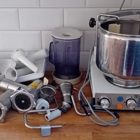 Bosch köksmaskin med tillbehör. Fint skick! Vintage 80-tal. Maskinen har en hastighetsväljare och en stor metall skål. Till köksmaskinen följer flera lösa delar och tillbehör, bland annat kvarnhus, skruv, matare och olika insatser, som kan användas för olika typer av matberedning. Enheten är eldriven med sladd.