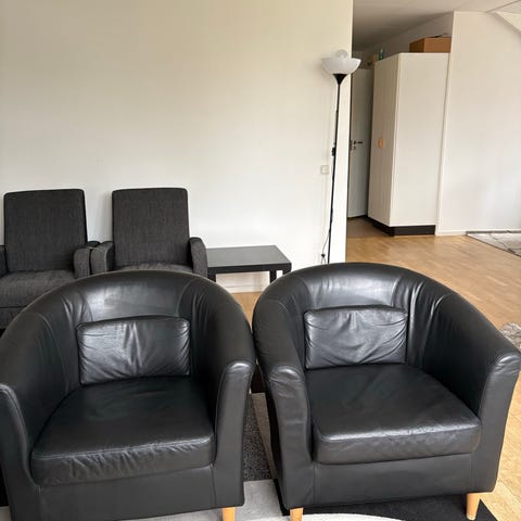 Två fåtöljer i skinn i bra skick. Himla sköna att sitta i.
