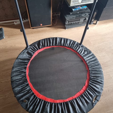 Home Fitness Code studsmatta med handtag i svart färg. Rund modell med flera ben för stabilitet och justerbart handtag i olika höjder. Passar för inomhusbruk till enklare konditions- och balansträning för vuxna och ungdomar. Hopputrymmet är omgivet av vadderat skydd runt kanterna för att täcka fjädrar och ram. Kan användas för exempelvis hemmaträning, rehabilitering och lågintensiv träning.