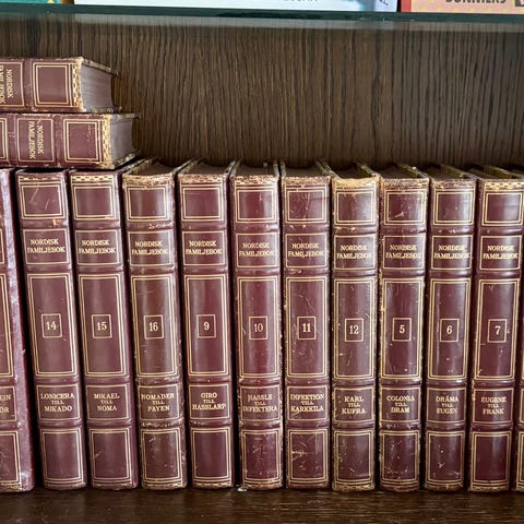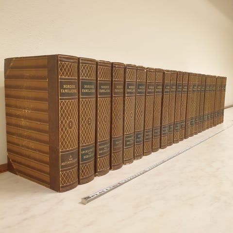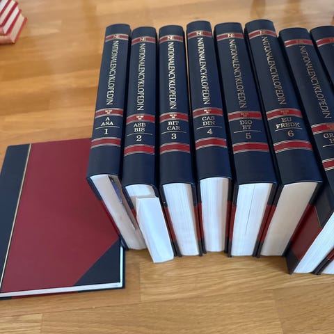 Nordisk Familjebok, bokserie i flera band. Böckerna har hårda pärmar i brun ton med guldfärgade ryggtryck. Verket är avsett som uppslagsverk med alfabetiskt ordnade artiklar inom många olika ämnesområden. Passar för referensläsning i hemmet eller på kontor och bibliotek.