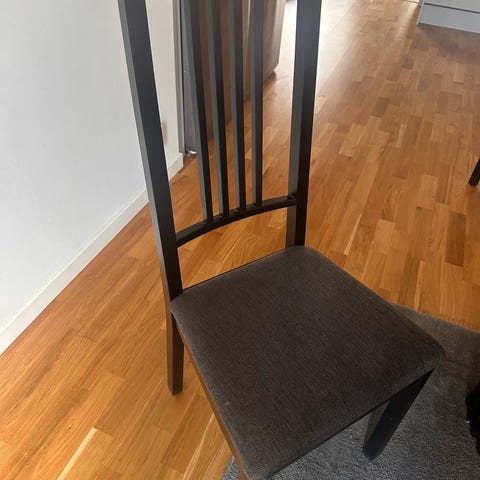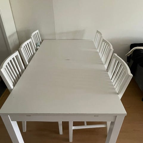 6 stolar och matbord. Små skavanker på bordet. Går att fälla ut/in så man kan sitta 4-8 personer.
