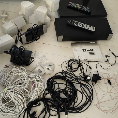 Bose högtalarsystem med flera komponenter. Systemet inkluderar flera mindre högtalare i både svart och vitt, två större basenheter/subwoofers samt en huvudenhet med inbyggd CD-spelare. Till systemet hör även fjärrkontroller och diverse kablar för anslutning. Passar för hemmabruk som stereosystem eller hemmabio, med möjlighet att placera satellithögtalarna runt rummet för surroundliknande ljud. Exakta modeller och tekniska specifikationer framgår inte av bilderna och kan behöva kontrolleras av köparen.