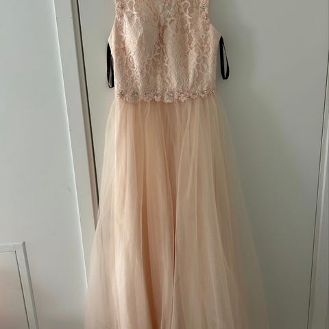 Vila festklänning i storlek S. Klänningen är rosa och tillverkad i polyester. Överdelen har spetsliknande mönster med ärmlös skärning och rundad halsringning fram. Baksidan har dragkedja för stängning. Nederdelen är lång med tunn tyllkjol. Passar till fest, bal och bröllop.