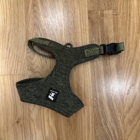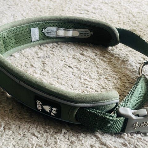 Feel Active halsband (35-45cm) i grå textil med reflexdetaljer och metallringar för fastsättning av koppel. Medföljer helt ny grön bajspåsehållare i plast med öppning för påsar, upphängningsögla och rem för att fästa på koppel eller väska. Lämpligt för hundpromenader och vardagsanvändning.
