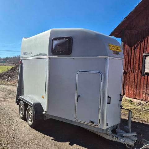 Sparsamt använd för att köra häst, har mest kört hö de senaste två åren. Släpet är välvårdat och helt. Plastkompositgolv, alltså helt utan organiskt material och kan därför inte ruttna. Extrautrustad med bomhöjd för shetlandsponny. Mjuk mellanvägg i genomskinlig plast/gummi. 13-polig släpvagnskontakt. Släpvagnslås godkänt för försäkring ingår. Dubbdäck och sommardäck ingår, de har alla rullat sparsamt och har mkt kvar att ge. Släpet ligger bra efter bilen och är lättmanövrerat.