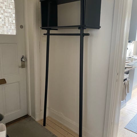 Påshyllan erbjuder gott om förvaringsplats samtidigt som den är lättplacerad. Här ryms allt från mössor och vantar i hallen till pyjamasar och leksaker i sovrummet. Björk med svarta linnepåsar. Nypris 3220:-