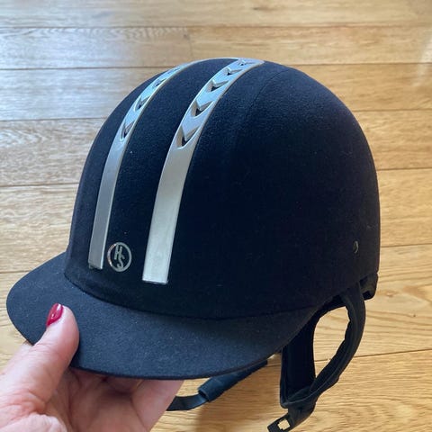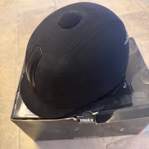 Svart ridhjälm med skärm och hakband. Hjälmen har en dekorativ mittpanel upptill och justerbart band under hakan. Passar för ridning och annan hästsport där huvudskydd behövs.