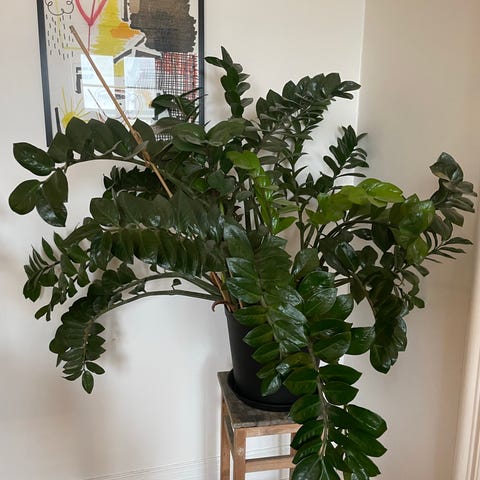 Fiolfikus med gröna blad i en brun glaserad kruka (ingår). Passar som inomhusväxt i ljusa rum, exempelvis vid fönster eller i vardagsrummet.