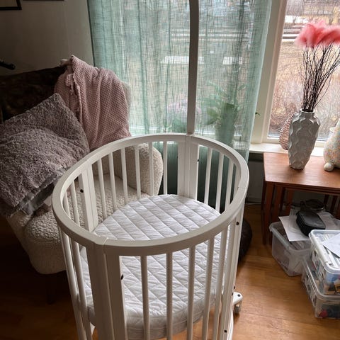 Sängen står på hjul (som går att låsa) för enkel förflyttning och har madrasser till båda storlekar.
