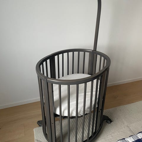 Stokke spjälsäng i hazy grey. Det är BÅDE mini och den större extension varianten.