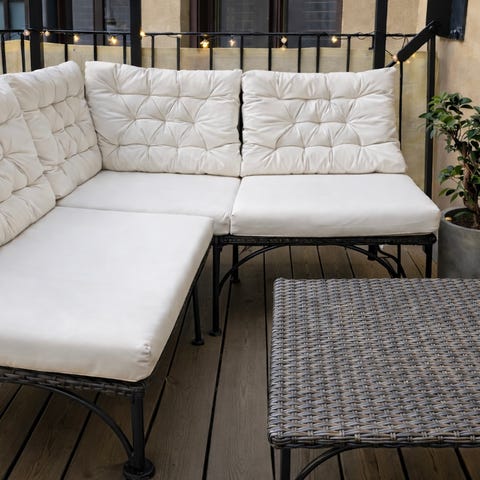 Hopfällbart cafébord 58x58 cm och två klappstolar också från Hillerstorp. Dynor ingår!