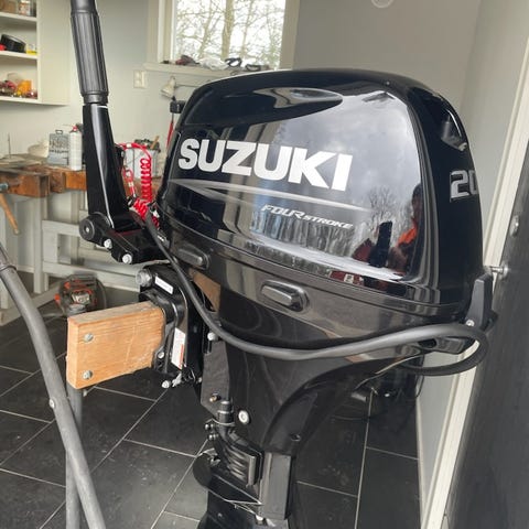 Suzuki DF20A utombordare med 20 hk i svart utförande. Motorn är en fyrtakts utombordare avsedd för montering på mindre till medelstora båtar. Den har rorkultsstyrning med reglage på handtaget samt dödmansgrepp. Motorn är försedd med bränslesystem anpassat för Suzukis Lean Burn-teknik enligt märkningen på kåpan. Passar som huvudmotor eller hjälpmotor på fritidsbåtar där en kompakt och relativt lätt 20 hk utombordare önskas.