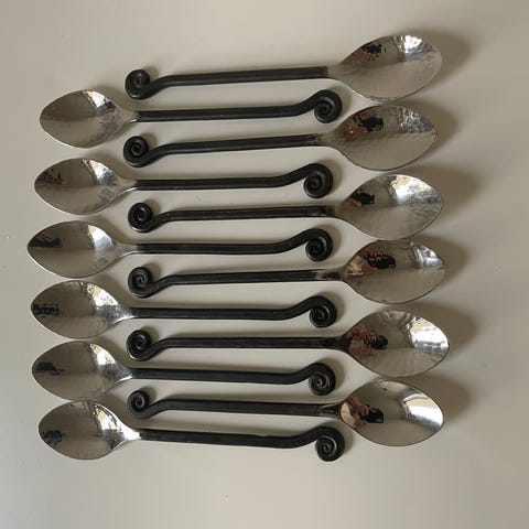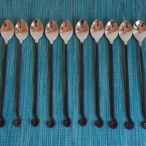 Jag säljer här 6 långskaftade eller cocktail skedar som är guldpläterade. Bedöma säljv via bilder. Där finns inget lite märke varken på skafter eller skedblad. Skedar är 19 cm långa. Tillverkare känner jag ej.